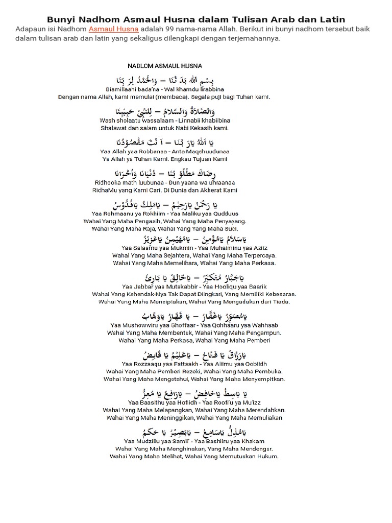 Dzikir nama nama allah 99 asmaul husna tentang teks dalil ayat makna arti khasiat manfaatnya dan tulisan gambar arab latin beserta artinya. As salaam السلام yang maha memberi kesejahteraan 6. Berikut ini 99 asmaul husna, teks arab dan latin beserta arti, dalil, keutamaan dan khasiatnya. See more of asmaul husna on facebook. Nadhom dapat juga diartikan sebagai mensyairkan sebuah teks, pengetahuan.
